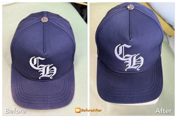 配達範囲外のさいたま市からお越し頂きました。 元は紺青のキャップ帽 全体的に赤く色褪せています。 遠方でしたのでLINEでビフォーアフターを送りつつ 紺色に蘇りました。 当店ではLINEを活用し 染み抜きや色補修等の経過をお伝えしております。 LINE登録はホームページで出来ますので ご利用頂けると嬉しいです。