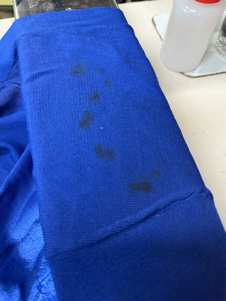 デニムについたシミ 薄っすらと黄色くみえますが深追いせずに染み抜き完了 理由はデニム特有の地色(柄)を壊したくないからです。 地色(柄)を壊してしまうと 元の地色(柄)に直すことは非常に技術がいります。 残念ながら当店ではまだ技術がたりませんので お客様には預かる時点でご説明してご了承頂いた上でお預かりしております。