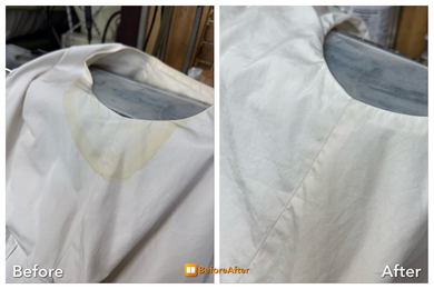 洗っていても汚れが残留していると黄色くなっていきます。 『しっかり洗っていたのに…』 とのご相談でした。 染み抜き前にまず 皮脂(油性)の汚れ その下の汗(水溶性)の汚れを処置して 黄色く変色したシミを染み抜きいたしました。